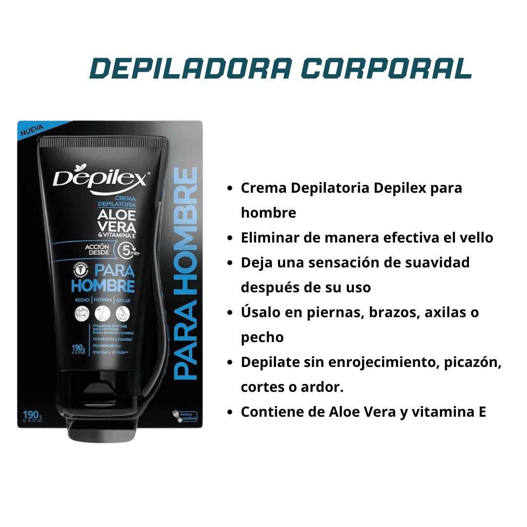 DEPILEX CREMA DEPILATORIA PARA HOMBRE ha sido diseñada para ser utilizada en las piernas, brazos, axilas y pecho. No aplicar en la cara, cabeza, nariz, orejas, rostro, ni zona genital ni perianal.